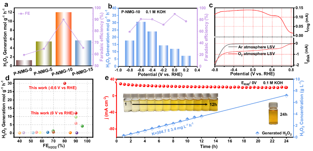 作为一种重要的化工原料,过氧化氢(H2O2)已经被广泛地应用于医疗、纺织以及污水处理等多个领域。此外,H2O2还被认为是一种极具潜力的新能源载体,有望在未来的清洁能源领域发挥重要作用。然而,H2O2的工业生产主要依赖于蒽醌法,其具有高能耗和高污染等诸多问题。通过电催化两电子氧还原(2e−-ORR)的路径合成H2O2不仅能量利用率高,还可以实现分布式制备,已达到较高的经济效益。近年来,2e−-ORR引起了人们越来越多的关注,开发高性能的催化剂也随之成为该领域的研究热点。在2e−-ORR催化剂领域,吡咯氮被认为是一种具有高选择性的构型。然而,由于吡咯氮只存在于碳基底的缺陷和边缘处,这极大地限制了其在多种氮构型中的比例,因而阻碍了相关高性能催化剂的发展。