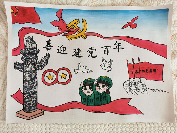 作品简介:五星红旗在天空飘扬,红色雄鹰在天空翱翔,暗示着新一代青年奋力前进、敢于拼搏。新一代青年们要加强廉政建设,增强党性修养,争做“忠诚干净、担当”的好党员。图片的中间为主题:喜迎建党百年。中间的和平鸽代表着中国人民团结一致,和平相处。图片的左下方“华表柱”与两个圆圈构成100(即建党百年)。图片下方的两个青年向着国旗敬礼,喜迎建党百年。