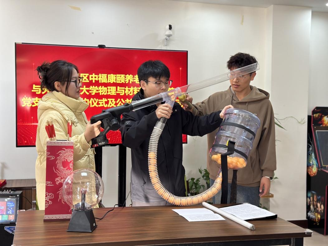 签约仪式结束后,科普实验活动正式开始。科普秀上,大家对辉光球和乒乓球机关枪产生了浓厚的兴趣,支部党员通过演示实验向大家科普了其中的物理知识,在场老人们纷纷亲手体验,感悟科学魅力。在“艾草健康按摩锤”动手实验中,现场30多位长者在支部党员和工作人员的带领下,亲手组装、亲身体验了动手制作的乐趣,学习到艾草按摩捶中蕴含的科学保健知识。
