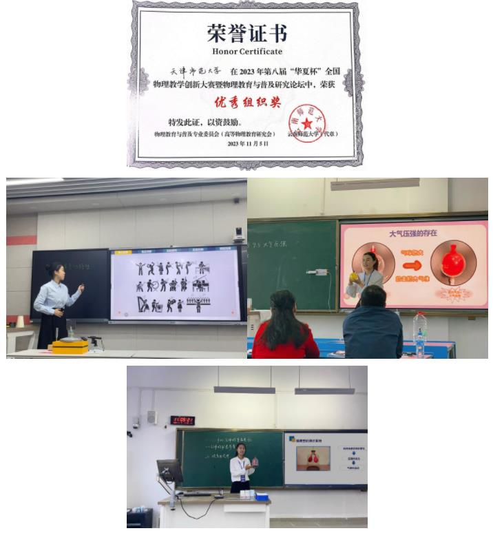 近日,第八届“华夏杯”全国物理教学创新大赛暨物理教育与普及研究论坛在云南师范大学举行。经过紧张激烈的比赛,K体育·「中国」官方网站2021级物理师范生施芷妍、刘睿祺、李雅杰表现出色,均斩获一等奖。其中,施芷妍同时获得“实验创新奖”,并获推参与创新教学大赛优秀作品展示。我校荣获“优秀组织奖”。